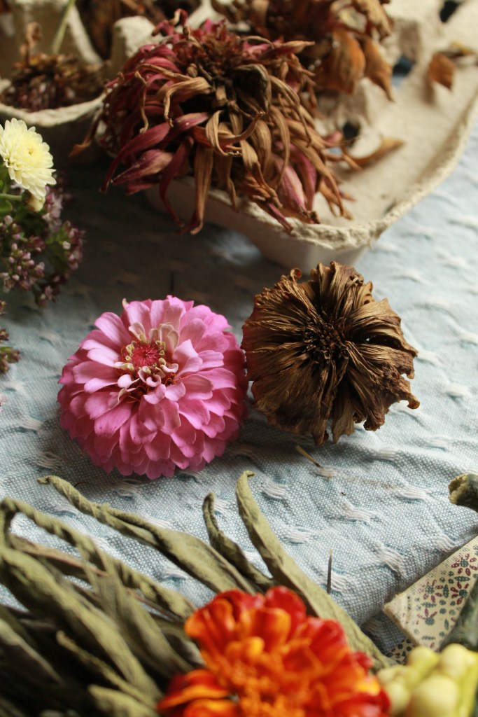 When seed saving zinnias, you must let the head of the zinnia dry completely on the stem before harvesting.