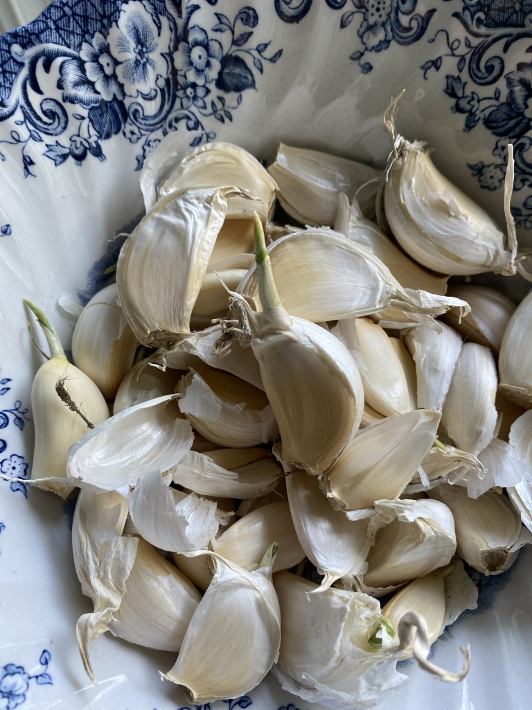 - Separate each clove being careful not to pull any papery skin off. (don’t plant any that has lost that protective papery skin; it will just rot away over winter)