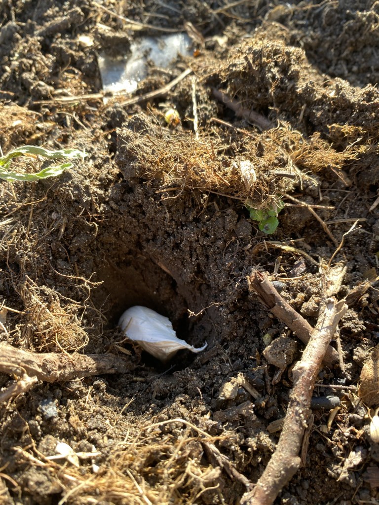 - Dig a 1-2-inch-deep hole and plant your garlic pointy tip up. (old root end should be downwards)