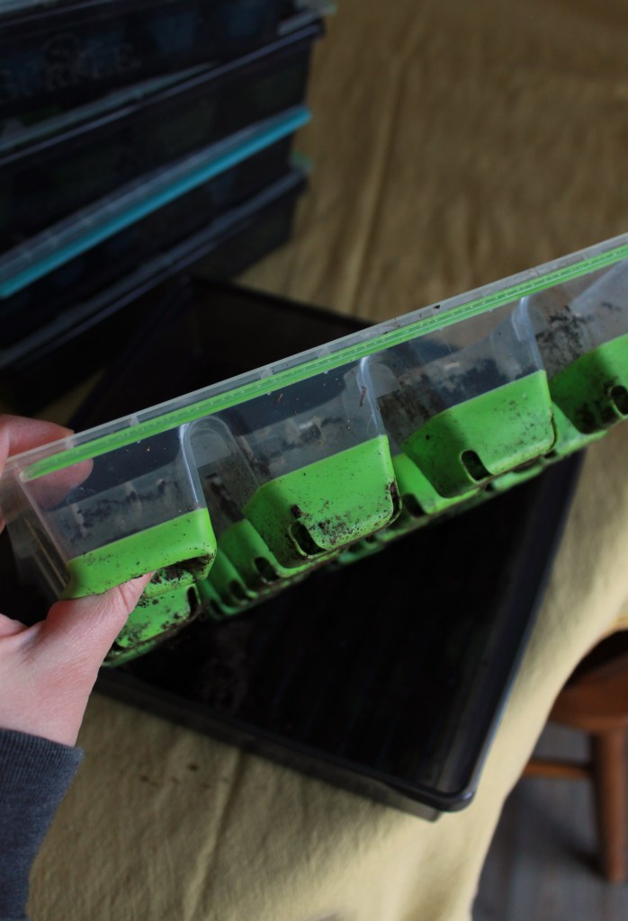 - Fill them with dry dirt first. Then pour water into the bottom tray and allow the dirt to soak up water overnight. I also plug my seed warmer mats in the night before too.