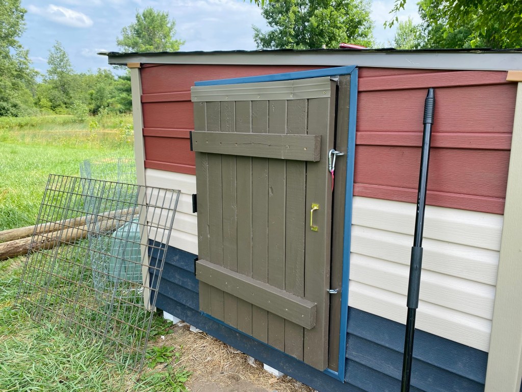 Lockable doors: We have coyotes, snapper turtles, foxes, skunks, and I am sure a few we don’t even know about for major predators to our ducks, so making sure the doors are hard enough to open for those animals were priority. I simply went with 2 keyhole latches and a carabineer clip for the locks. Simple, cheap, effective. The front entrance door has one lock and the back has two. These doors were made from scrap studs we had from previous projects, and that made these doors very heavy! We are hoping the weight of the doors is also a deterrent to animals as well.