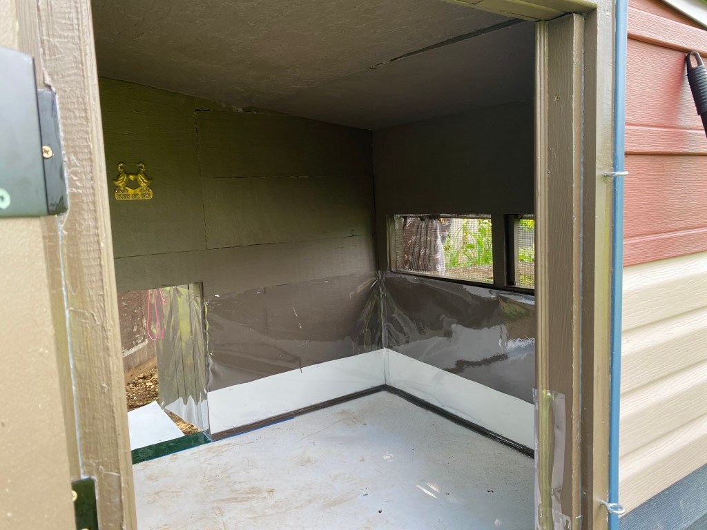 Nothing sharp exposed or bare paint: Specifically, I didn’t want bare paint exposed where the ducks will actually poop. The upper parts of the interior are OBVIOUSLY bare paint. The entire interior got two coats of Mold Killing paint and this fantastic Exterior Waterproof paint in Coffee that we found in the “oops” paint section at Home Depot (summer is a great time to grab marked down paint!). I used the brown paint to cover any wood surface both inside and outside. To cover the nails from the siding, the walls got leftover foam insulation we had from other projects and an extra layer of plywood. The ceiling is also plywood to cover the nails from the roofing. Again, not professional level of finish work, but everything is secured, and all the paintable surfaces are covered.