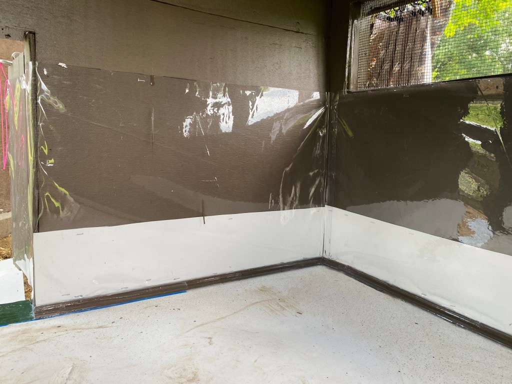 Plastic floors and walls: Ducks poop is not like chicken poop; chickens have solids that they drop, while ducks have semi solids that they spray (sorry for the crude picture but that’s the truth). This is where ducks need a different set up from chickens. After the elevated base was built we put a sheet of this plastic down for the floor from Home Depot; it’s flexible and easy to cut, and fairly easy to glue down to the base. The walls were then built on top of the plastic sheet. We grabbed a second white plastic sheet and cut it to make a hard backsplash that was stapled into the walls. Then we bought a clear plastic sheet (this one here from Walmart) to put over top of the white plastic. The white plastic was put in place to close any gaps in the wood walls and the floor, while the clear plastic was the surface we are willing to clean. The clear plastic reaches 18 inches high which is plenty of room. I then painted spare trim pieces we had in the garage to conceal the seams between the floor and the wall. I then laid a very thick layer of kitchen/bath silicone in clear over top of the bottom trim to further close any gaps and give the wood trim an extra layer of protection against the poop (this silicone is what I used to fill in gaps on the exterior as well).