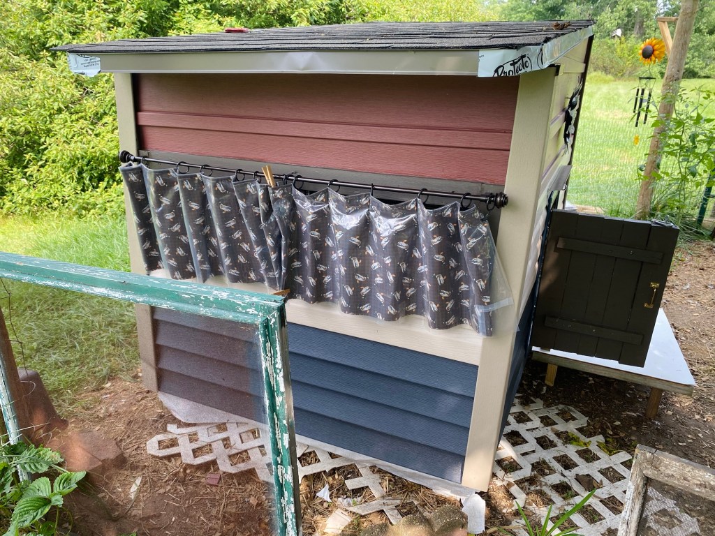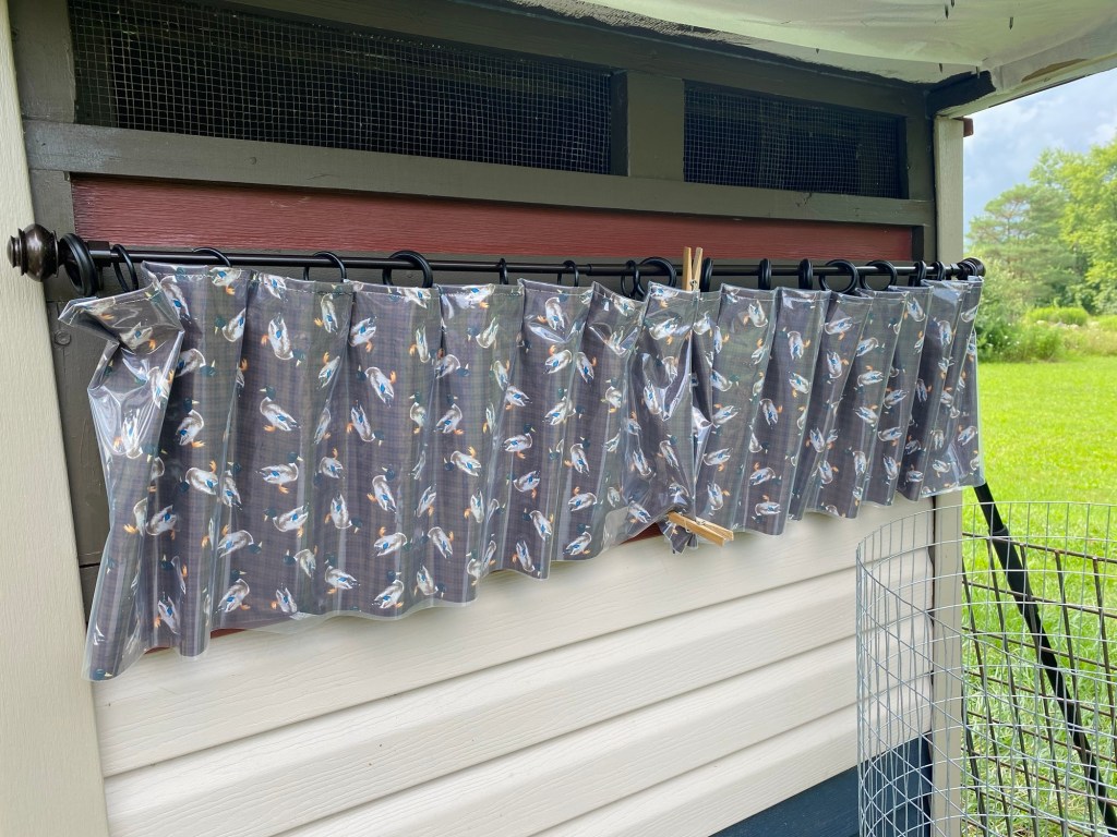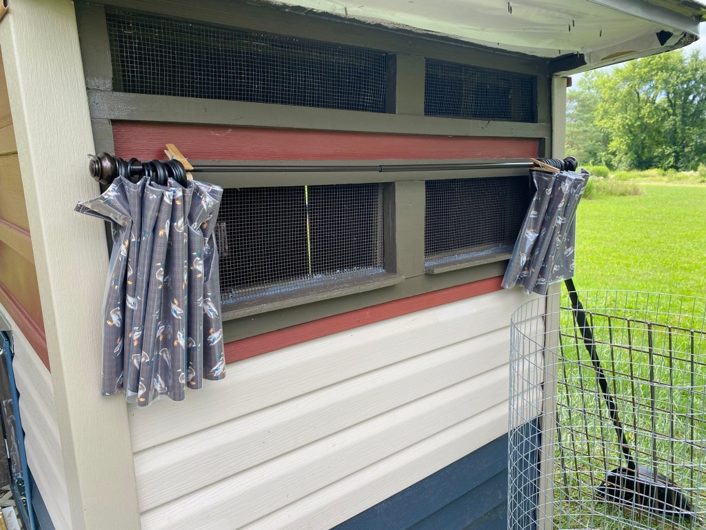 A method to cover the windows in stormy weather: We simply ran out of supplies and willpower to make shutters for the windows. Our windows are simply hardware cloth that are fastened to the framework of the build. The walls and window framing were built around the placement of the hardware cloth. We also put a permanently open vent window at the very top of the tall side; this will never be covered to ensure air is constantly being let out of the coop. For now, I grabbed a rust-free curtain rod, some clips, a shower curtain, and 2 yards of cotton fabric from Walmart. Simply cut and sewn the shower curtain on top of the cotton fabric for some outdoor curtains. It’s does work! Just only sew a top seam so the cotton has breathing room to dry if it gets wet from dew. I will close them when we get rain, heavy snow, or if it’s going to be very cold that night; besides that, they will be open to allow as much air flow in/out as possible.