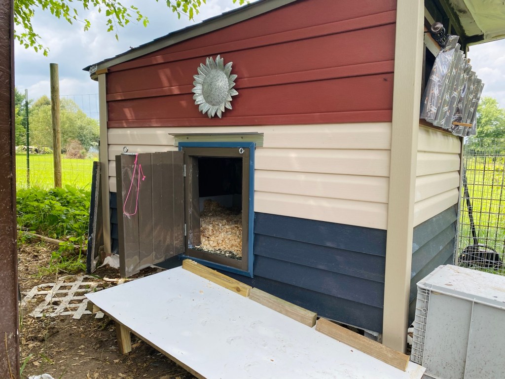 Nonslip ramp: At the time of writing this, our ramp is still a work in progress. We have very little supplies & budget left of build this, but we thankfully made it work. Just make sure ducks can grip your ramp. We used leftover clear shower grips and used leftover plastic sheeting from the interior to help keep the wood underneath dry. Soon, I will paint or seal the base of the ramp to keep that waterproof as well.